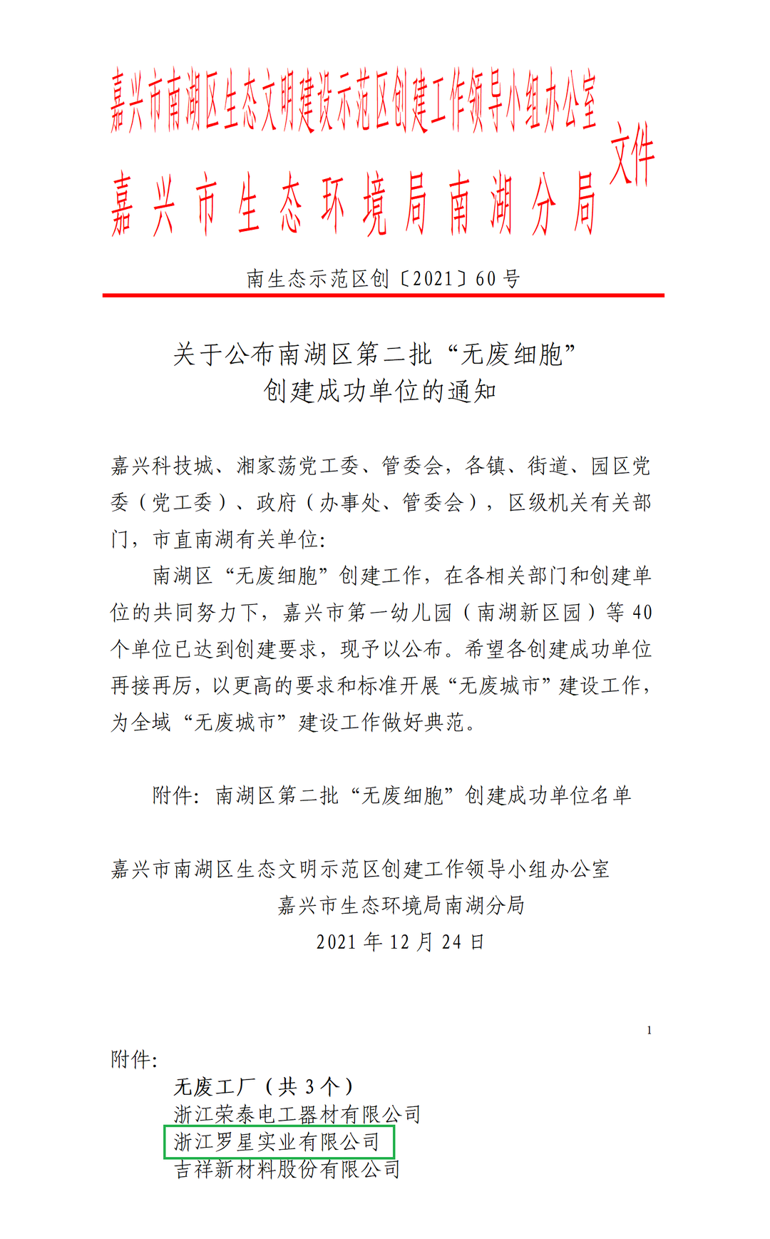 日前,嘉興市南湖區(qū)公布了第二批“無廢細胞”創(chuàng)建成功單位,我司成功上榜!